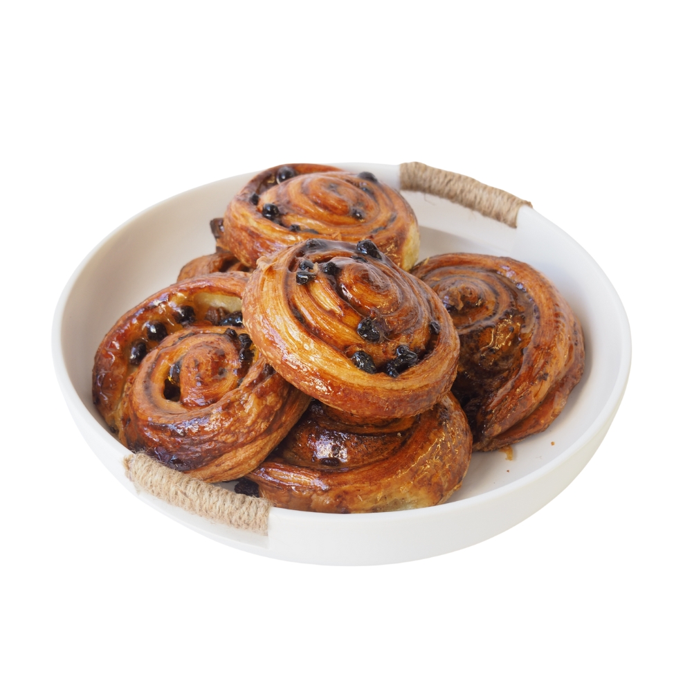 Flaky Viennoiserie dough rolled with raisin filling. Dairy-Free – Pareve.